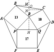 | £¨3£©Èçͼ£¬¹ýR×÷RH¡ÍPQ£¬½»BCÓÚµãO£¬·Ö±ð¹ýB¡¢C×÷BM¡ÍRH£¬CN¡ÍRH ·Ö±ðÖ¤Ã÷¡÷PRH¡Õ¡÷RBM£¬¡÷QRH¡Õ¡÷RCN£¬µÃRH=BM=CN£¬ Ö¤¡÷BMO¡Õ¡÷CNO£¬ ËùÒÔS¡÷BMO=S¡÷CNO ¹ÊS¡÷PQR=S¡÷PRH+S¡÷QRH=S¡÷RBM+S¡÷RCN=S¡÷BCR ͬÀí¿ÉÖ¤£ºS¡÷APF=S¡÷DEQ=S¡÷PQR=S¡÷BCR ÀûÓù¹Í¼·¨¿ÉÖªS¡÷PQR=5.5£¬¹Ê»¨Ì³Ãæ»ýΪ5.5¡Á4+40=62¡£ |