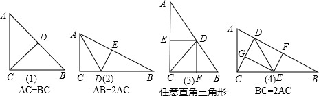 解:(1)取斜边AB中点D连接CD,因为AC=BC,所以CD⊥AB,所以等腰直角三角形ACD和CDB全等,且都与三角形ABC相似;