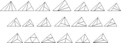 第一排第一个在三角形BC边上找出四等分点,与A连接,根据等底同高可得四个三角形面积相等;