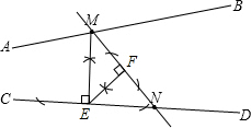 分析:(1)以点M为圆心,以任意长为半径画弧,与CD相交于两点,再以这两点为圆心,以大于这两点间距离的一半为半径画弧,相交于一点,然后过点M与交点,作直线与CD相交于一点,即为所求作的点E;再以点E为圆心,以任意长为半径画弧,与MN相交于两点,再以这两点为圆心,以大于这两点间距离的一半为半径画弧,相交于一点,然后过点E与交点,作直线与MN相交于一点,即为所求作的点F;