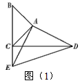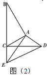 | 解:(1)如图(1), ∵∠DAE=∠BAC=90°, ∴∠CAD=∠BAE, 在△ACD和△ABE中,AC=AB,AD=AE, ∴△CAD≌△BAE, ∴CD=BE, ∴∠ACD=∠ABE, ∵∠BAC=90°, ∴∠ABE+∠ACB=90°, ∴∠ACD+∠ACB=90°, 即CD⊥BE; (2)如图(2),①不成立; 理由如下: ∵AB=kAC,AE=kAD, ∴ 又∠BAC=∠DAE, ∴∠DAC=∠EAB, ∴△ACD∽△ABE, ∴ ∵AB=kAC, ∴BE=kCD, ∵k≠1, ∴BE≠CD, ∴①不成立; ②成立, 由上可知,∠ACD=∠ABE, 又∠BAC=90°, ∴∠ABE+∠ACB=90°, ∴∠ACD+∠ACB=90°, 即CD⊥BE,即②成立。 |