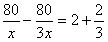 AB两地相距80千米,一辆公共汽车从A地出发开往B地,2小时后又从A地同方向开出一辆小汽车,小汽车的速度是公共汽车的3倍,结果小汽车比公共汽车早40分钟到达B地,求两种汽车的速度。