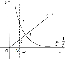解答:解:A.将y1=x与y2=联立得: