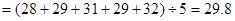 | A、平均数为30 | B、众数为29 | C、中位数为31 | D、极差为5 |
