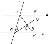 解:如图所示,直线a,b被直线c所截,且a∥b,直线AB平分∠CAE,直线CD平分∠ACF,AB,CD相交于点G.