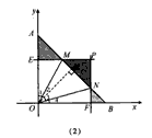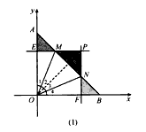 | 解:(1)=;y= (1)当x= ∴点P的坐标为 可得四边形EOFP为正方形(如图(1)), 过点D作OH⊥AB于H, ∵在Rt△AOB中,OA=OB=1, ∴ H为AB的中点, ∴ 在Rt△EMO和Rt△HMO中, ∴Rt△EMO≌Rt△HMO, ∴∠1=∠2, 同理可证∠3=∠4, ∵∠1+∠2+∠3+∠4=90°, ∴∠2+∠3=45°, ∴∠MON=45 ° |