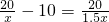 汛期将至,我军机械化工兵连的官兵为驻地群众办实事,计划加固驻地附近20千米的河堤。根据气象部门预测,今年的汛期有可能提前,因此官兵们发扬我军不怕苦,不怕累的优良传统,早出晚归,使实际施工速度提高到计划的1.5倍,结果比计划提前10天完成.问该连实际每天加固河堤多少千米?列方程解此应用题时,若计划每天加固河堤x千米,则实际每天加固1.5x千米.根据题意可列方程为