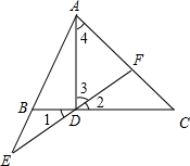 分析:根据等边对等角的性质可得∠1=∠E,再根据三角形的一个外角等于与它不相邻的两个内角的和可得∠ABC=2∠1,从而得到∠1=∠ACB,再根据对顶角相等可得∠1=∠2,然后求出∠2=∠ACB,根据等角对等边可得CF=DF,再根据垂直的定义求出∠2+∠3=90°,根据直角三角形两锐角互余求出∠ACB+∠4=90°,然后求出∠3=∠4,根据等角对等边可得AF=DF,从而得证.