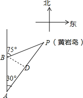 分析 过B作BD⊥AP于D,由已知条件得:AB=20×2=40,∠P=75°-30°=45°,在Rt△ABD中求出BD=$\frac{1}{2}$AB=20,在Rt△BDP中求出PB即可.