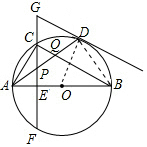 分析 由于$\widehat{AC}$与$\widehat{BD}$不一定相等,根据圆周角定理可知①错误;连接OD,利用切线的性质,可得出∠GPD=∠GDP,利用等角对等边可得出GP=GD,可知②正确;先由垂径定理得到A为$\widehat{CF}$的中点,再由C为$\widehat{AD}$的中点,得到$\widehat{CD}$=$\widehat{AF}$,根据等弧所对的圆周角相等可得出∠CAP=∠ACP,利用等角对等边可得出AP=CP,又AB为直径得到∠ACQ为直角,由等角的余角相等可得出∠PCQ=∠PQC,得出CP=PQ,即P为直角三角形ACQ斜边上的中点,即为直角三角形ACQ的外心,可知③正确;