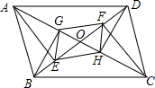 分析:首先根据平行四边形的性质可知:BO=DO,AO=CO,再证明△ABE≌△CDF,△ABG≌△CDH,根据全等三角形的性质可得:BE=DF,AG=CH,从而得到GO=HO,EO=FO,再利用对角线互相平分的四边形是平行四边形可证出四边形GEHF是平行四边形.