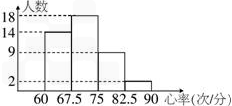 由图所示,心率在67.5~75范围内的学生最多,占统计人数为18,故比例为