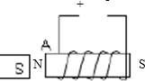 解答:解:磁体的S极与通电螺线管的A端相吸,所以通电螺线管的左端为N极,右端为S极,再由右手螺旋定则得出电源左端为正极,右端为负极.如图: