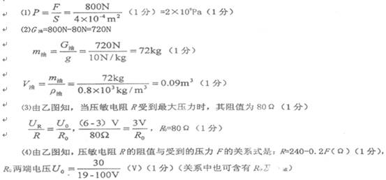 (1)若压敏电阻与油箱的接触面积是4×10 -4m2,则压敏电阻能承受的最大压强为多大?