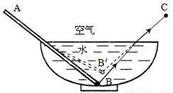 解答:解:在图中B′点是B点的像,光由B点发出,经水面射入空气中时发生折射,折射角大于入射角而射入C点.B′就在折射光线的反向延长线上.答案如图: