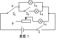 小雨的房间里,S为房间电路的总开关。当将单刀双掷开关S1拨到a处,房间吸顶灯L1亮。学习时为了使光照强一些,再闭合开关S2,台灯L2也亮。当将S1拨至b处,L1 、L2都熄灭,而可调节亮度的床头灯L3亮。