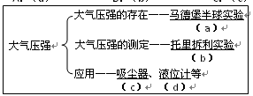 图为教科书“大气压强”一节的知识结构图,其中(a)、(b)、(c)、(d)四项有下划线的内容中不正确的一项是