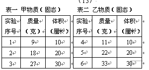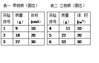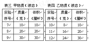 (4)为了进一步研究,他们又通过加热方式使甲、乙物质都变为液态,再用量筒和天平分别测出它们的体积和质量,记录数据如表三、表四所示。进一步综合分析比较表一和表三(或表二和表四)的资料及实验现象,可初步得出:___________________________________![]()
