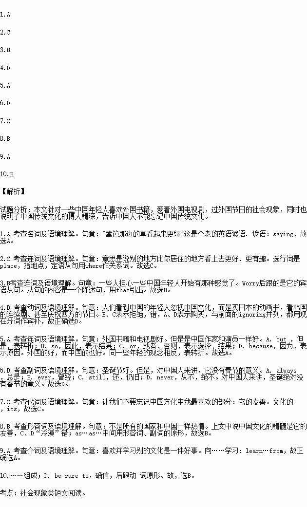 "The grass looks greener on the other side of the fence." That's an old in English. It means other places often look better, more interesting than the place you live. Some people worry young Chinese are beginning to feel that way. They see young Chinese ignoring 忽视Chinese culture and, instead, Japanese cartoon books, watching Korean soap operas and even celebrating western holidays.