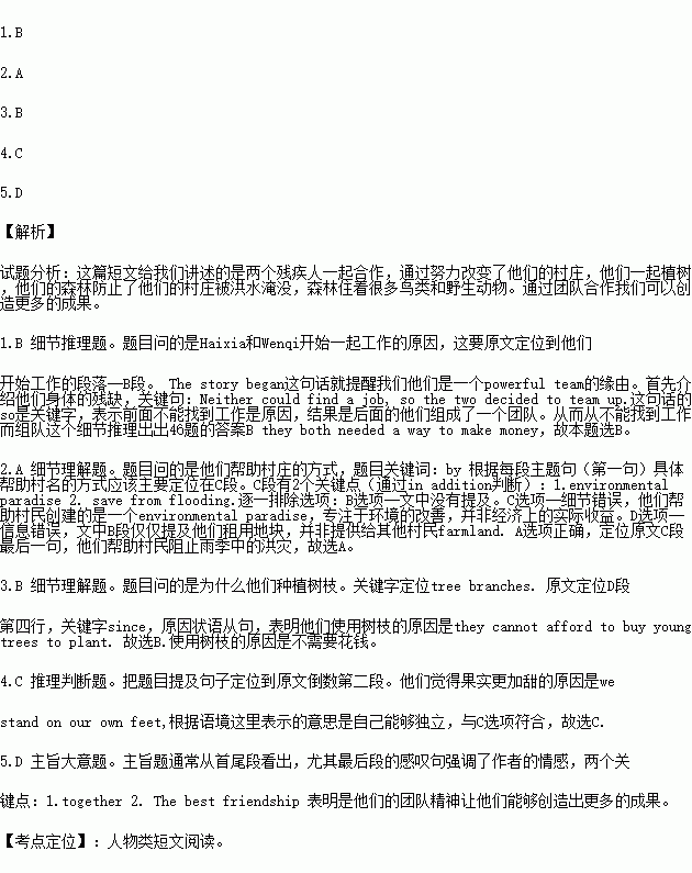 could find a job, so the two decided to team up. They rented some poor land and began to plant trees. In return, the local officials paid them a small fee. Haixia and Wenqi never imagined that they would end up creating an environmental paradise. Their forest now has over 10,000 trees, hundreds of birds and many other wild animals. In addition, it saves the village from river flooding during the rainy season. When the friends work together, they focus on their strengths not their disabilities. Their day begins at 7 a.m. when the sightless Haixia carries Wenqi across the river to get to their worksite. Since they cannot afford to buy young trees to plant, the two use branches from existing trees. Haixia climbs to the tree-top and with Wenqi’s direction, selects the perfect branch. He then digs a hole and carefully plants it. Finally Wenqi waters the area.