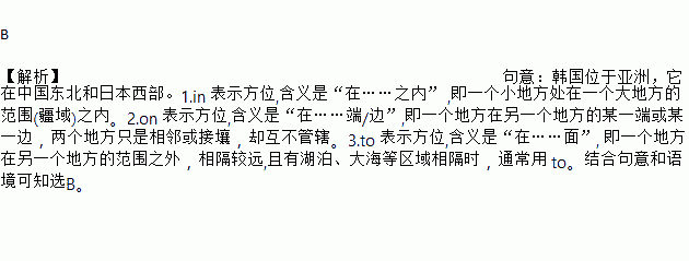 B ¡¾½âÎö¡¿¾äÒ⣺º«¹úλÓÚÑÇÖÞ£¬ËüÔÚÖйú¶«±±ºÍÈÕ±¾Î÷²¿¡£1.in ±íʾ·½Î»,º¬ÒåÊÇ¡°ÔÚ¡¡Ö®ÄÚ¡± ,¼´Ò»¸öСµØ·½´¦ÔÚÒ»¸ö´óµØ·½µÄ ·¶Î§(½®Óò)Ö®ÄÚ¡£2.on ±íʾ·½Î»,º¬ÒåÊÇ¡°ÔÚ¡¡¶Ë/±ß¡±,¼´Ò»¸öµØ·½ÔÚÁíÒ»¸öµØ·½µÄijһ¶Ë»òijһ±ß£¬Á½¸öµØ·½Ö»ÊÇÏàÁÚ»ò½ÓÈÀ£¬È´»¥²»¹ÜϽ¡£3.to ±íʾ·½Î»,º¬ÒåÊÇ¡°ÔÚ¡¡Ã桱, ¼´Ò»¸öµØ·½ÔÚÁíÒ»¸öµØ·½µÄ·¶Î§Ö®Í⣬Ïà¸ô½ÏÔ¶,ÇÒÓкþ²´¡¢´óº£µÈÇøÓòÏà¸ôʱ£¬Í¨³£Óà to...