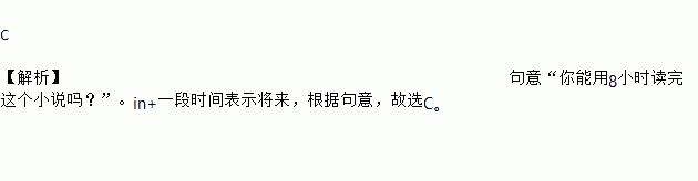 C 【解析】句意“你能用8小时读完这个小说吗?”。in+一段时间表示将来,根据句意,故选C。科目:初中英语 来源:牛津译林版8B Unit 2 单元检测 题型:单选题