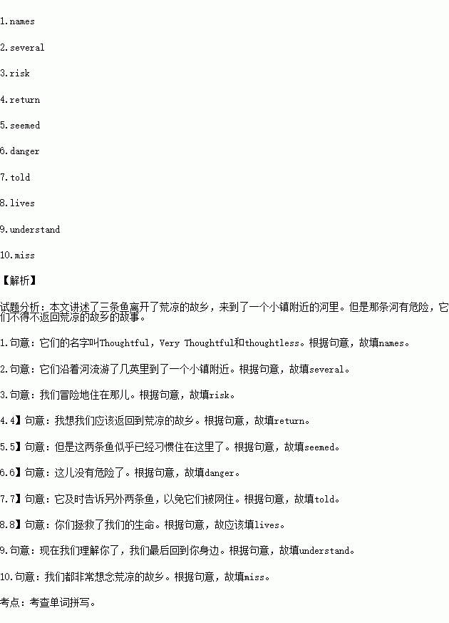 “You saved our 8. (生命), Very Thoughtful!” they both cried. “Now we 9. (理解)you and we’d like to go back with you. We all 10. (想念) the wild country.” That day, they swam back to their old home and lived safely ever after.