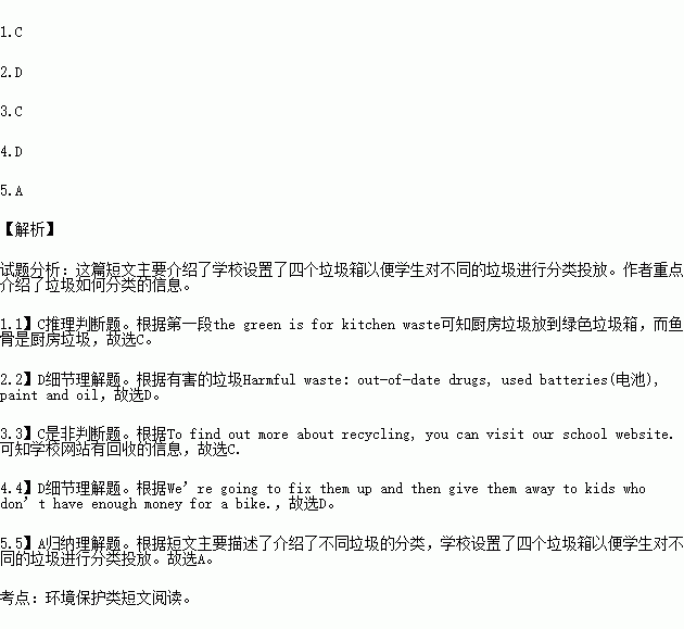 Paper: Newspapers, magazines, boxes must be clean enough to be recycled. Warning: Paper tissues and wallpaper are not recyclable as paper and should be kept separately. PMD waste: Packaging made of Plastic or Metal and Drink boxes are used to make new packaging. Warning: Plastic pots (e.g. yoghurt pots), plastic bags must not be included with the PMD waste. Harmful waste: out-of-date drugs, used batteries(电池), paint and oil … Besides, if you don’t need your old bikes at all, our school volunteers will collect them. We’re going to fix them up and then give them away to kids who don’t have enough money for a bike. To find out more about recycling, you can visit our school website. |