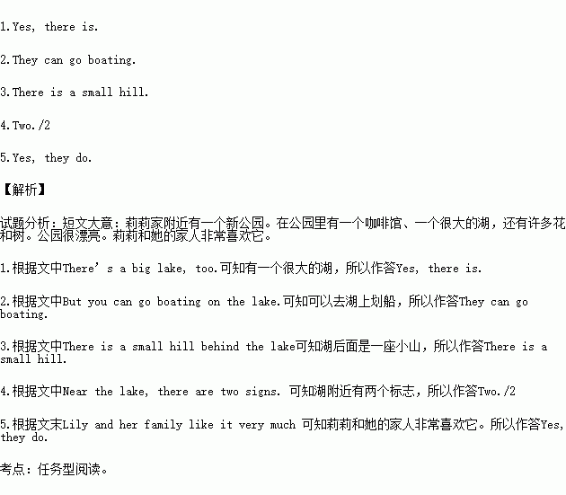 There is a new park near Lily’s home. It’s fine today. Lily and her family are in the park now. On their left, there is a café(咖啡屋). There’s a big lake, too. There are many flowers and trees around(在…周围) the lake. There is a small hill behind the lake. Near the lake, there are two signs. One says, “Don’t swim in the lake!” The other says, “No fishing!” But you can go boating on the lake. There is a beautiful garden in the middle of the park. There are green grass and beautiful flowers in it. There are some small shops between the lake and the garden. The park is very nice. Lily and her family like it very much.