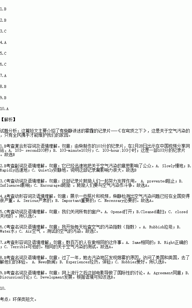 A documentary about smog(雾霾) has become well-known across the country with over 100 million views in less than 24 hours. Under the Dome, the documentary by Chai Jing, was shown on video-sharing websites in China on Feb 28. It has pushed the public awareness (意识) about air pollution and people to join in efforts to make a difference.