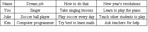 | I have some friends, and Julie and Ken are my best friends. The other day we talked about our new year's resolutions. I want to learn to play the piano because I want to be a singer. I will also take singing lessons. As for Julie, she wants to become a soccer player and she is going to play soccer every day. She has a plan that she would like to teach other students to play soccer after school. Ken is going to try his best to learn math. If he has problems with his studies, he will ask the teachers for help. His dream job is to be a computer programmer. 答案不唯一 |