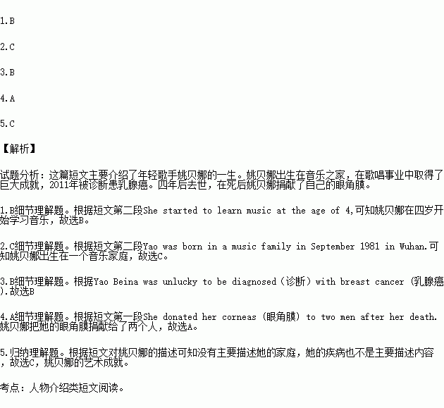 Yao Beina was unlucky to be diagnosed(诊断)with breast cancer (乳腺癌). She had a successful operation(手术) in 2011. She has fought against the illness for about four years while keeping singing, but sadly she failed. Although she’s gone, her fans will remember her beautiful voice and kindness for ever.