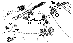 剖析:本题是关于“线路”题材的任务型阅读.是考生熟悉的题材,地道、优美的文字,交给他们一个比较真实的任务,旨在考查他们用英语处理现实生活中遇到的事情的能力.题目结合文字给出简明的线路图以及 Jim的出发点,要求考生根据信的内容将正确的路线(虚线)描成实线.本题层次分明,前四段路线都比较简单明了.但最后一段路线的描述难度较大,应抓住“Remember not…,unless,take the right turning, oil station”等关键词,特别是unless(除非).抓住并理解了这些关键词就不难作出判断.答案为从Jim所站位置开始画出实线从①-②-③-④-⑤(如图)