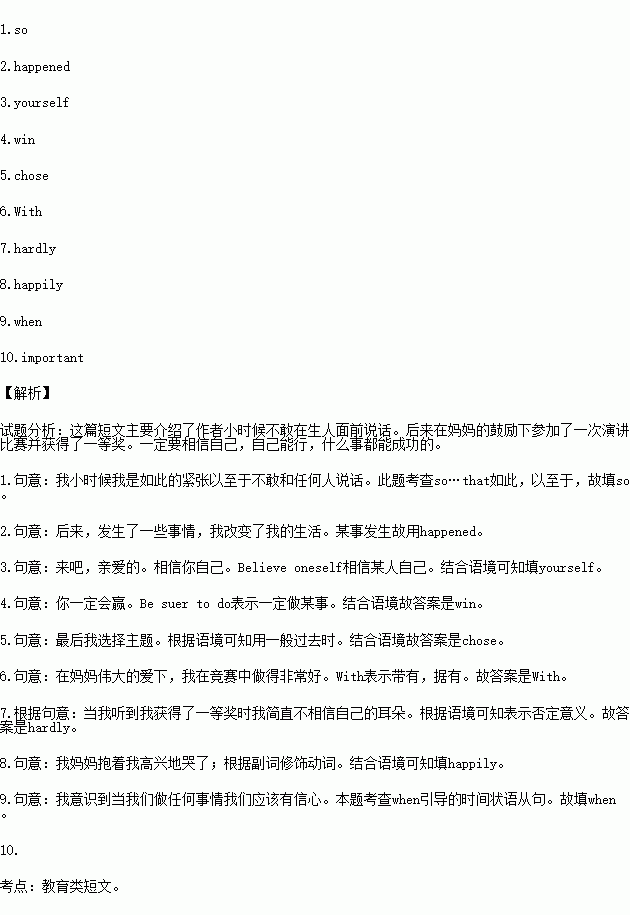 When I was young, I was1. nervous that I couldn’t talk to anyone. My classmates often laughed at me. I was sad but could do nothing. Later, something 2. . I changed my life. It was an English speech contest. My mom asked me to take part in it. It meant I had to speak in front of all the teachers and students in my school.