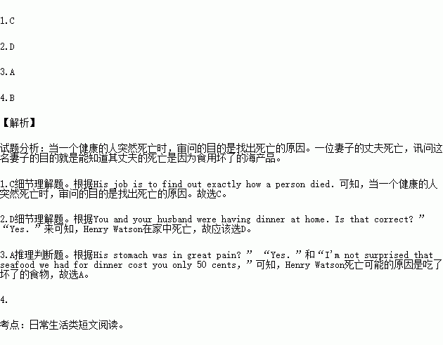 The man’s wife was explaining something.She was very sad and had to stop from time to time.The coroner did not want to make her sadder than necessary ,but he had to find out the truth.There were questions he had to ask.