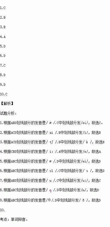 单词辨音 在A、B、C、D四个选项中,选出划线部分读音与其余三个不同的选项,