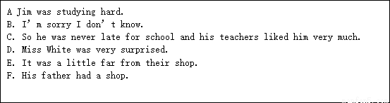 I had pen friend. His name was Jim. Jim lived in a town near New York._ 1.___ and his mother was a doctor. He was seven years old and began to go to school this September.__ 2.___ . And his father drove a car to take him to school five days a week. ___3.___. It was Monday that day. Miss Whites was teaching them to count from one to ten in the morning. __4.___. Soon he could count them. Miss White was very happy and asked,” How many people are there in your family, Jim? ” Jim stood up and said, “Two, Miss White ” “Who are they?” “My father and my mother.” “Oh?” __5.__.She then said, ”There are three people in your family.” “But now I’m not at home. I’m at school, you know”.