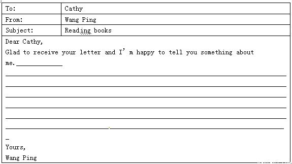 假如你是王平,你的英国笔友Cathy发来邮件说她在 “Reading Week”时读了几本有趣的书,她想跟你交流一下,了解你的读书情况。请你根据她的问题回复邮件。