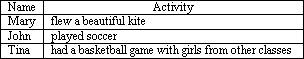 听力材料: (A)Listen and choose the right pictures. 1.W:Could you tell me where the police station is? M:Sorry, I don't know.You'd better ask the policeman over there. W:Good idea.Thank you very much. Q:Who will help the woman? 2.W:Which city do you like best? M:Beijing.It's a very beautiful city. Q:Which city are the two speakers talking about? 3.W:Excuse me, can you tell me how to get to the church? M:The church?It's a long way from here.You'd better take a taxi. W:OK, thank you. Q:How will the woman go to the church? 4.W:What about going out for a walk? M:OK.Let's go to the bridge. Q:Where are the two speakers going? (B)Listen and fill in the chart. I have three good friends.They are Mary, John and Tina.Last Friday we had a school trip.Mary likes flying kites.She flew a beautiful kite.John prefers soccer.He usually play soccer with boys after school during the school trip, he played for almost the whole day.Basketball is also a boys' game, but it's also Tina's favorite sport.Tina had a basketball game with girls from other classes on our school trip.What an interesting trip! |