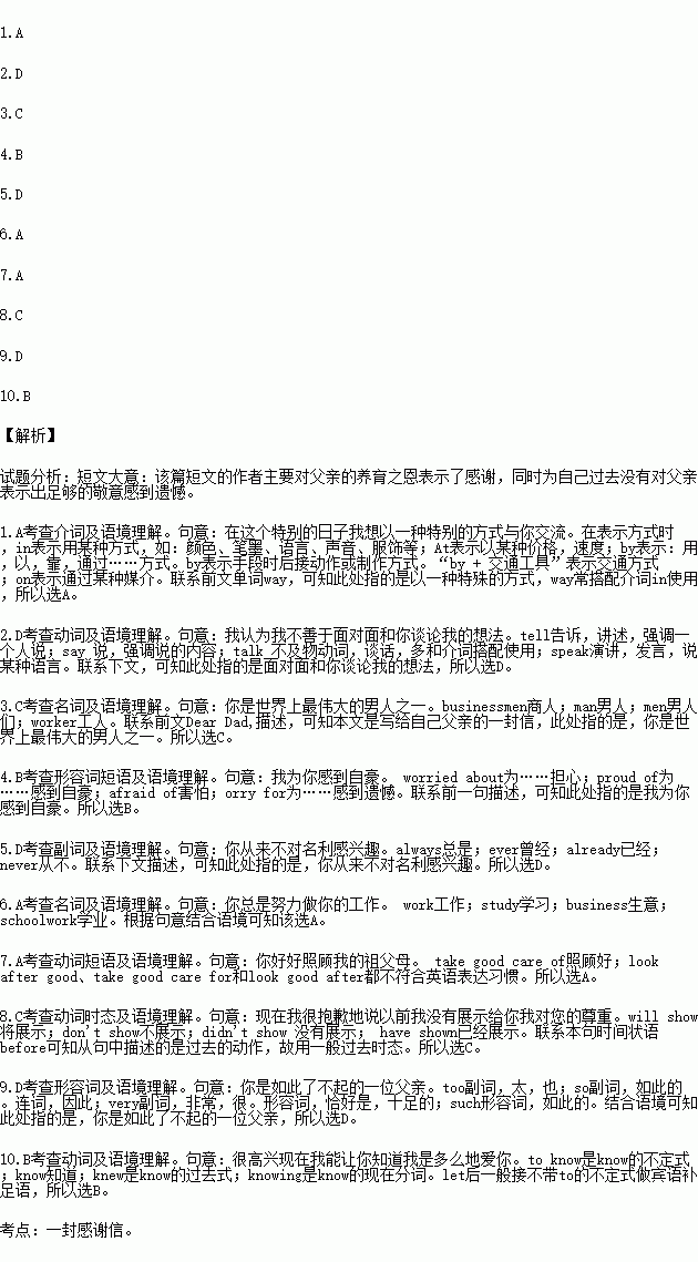 In the past, I don't care whether you were with me or not. Now I am sorry to say I you my respect ( 尊重 ) before. But I am thankful for what you have done for me. I am quite lucky that I have a good father. I am happy that now I can let you how much I love you. You arc successful as a son, a husband. a father and a friend.