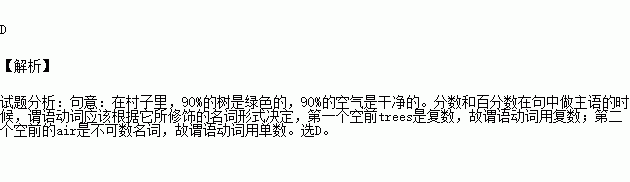 In the village,ninety percent of the trees_______green and ninety percent of the air________clean.