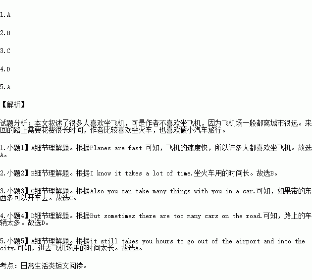Many people like to travel by plane, but I don’t like it because an airport (机场) is usually far from the city. You have to get there early and wait for hours for the plane to take off(起飞)and it is often late. You can’t open the windows. You can’t choose the food. Planes are fast, but it still takes you hours to go out of the airport and into the city.