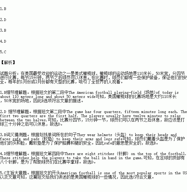The American football playing-field (场地)of today is about ll0 meters long and about 50 meters wide. The game has four quarters, fifteen minutes long each. The first two quarters are the first half. The players usually have twelve minutes to relax between the two halves.