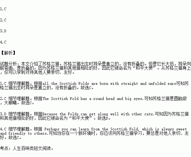 In 1961, a man found a strange cat on his farm in Scotland. The cat’s ears were folded(折着的), bent(弯曲)forward, on its head. In fact, this was a new kind of cat. People named it the “Scottish Fold”.