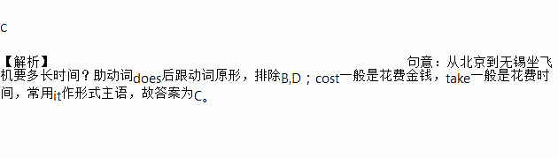 C 【解析】句意:从北京到无锡坐飞机要多长时间?助动词does后跟动词原形,排除B,D;cost一般是花费金钱,take一般是花费时间,常用it作形式主语,故答案为C。科目:初中英语 来源:安达市人教版英语九年级unit3单元测试卷 题型:单选题