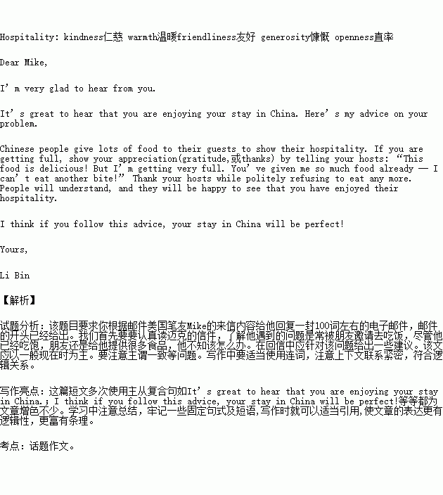 假如你是李滨,你的美国笔友Mike给你发来一封电子邮件,内容如下: