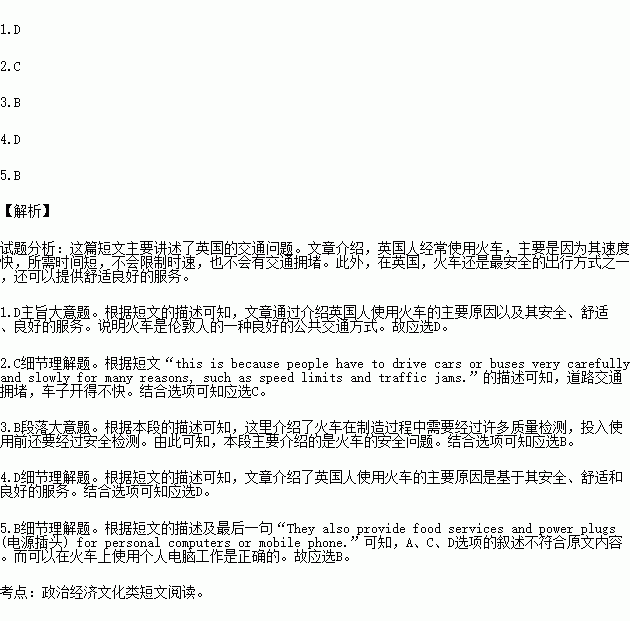 What's more, trains in Britain are comfortable and provide fine services(服务) for their users. When you are on a London train, you will find that the train has comfortable tables and seats where people can sit. They also provide food services and power plugs(电源插头) for personal computers or mobile phone.