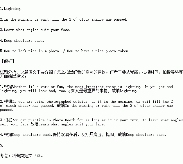 The key thing is no shadow(阴影). If you are being photographed outside, do it in the morning, or wait till the 2 o’clock shadow has passed. Also don’t let pictures in the magazines stress you out – all the pictures are taken by great photographers. And all the faces have had pimples (丘疹,粉刺) taken out by computers.