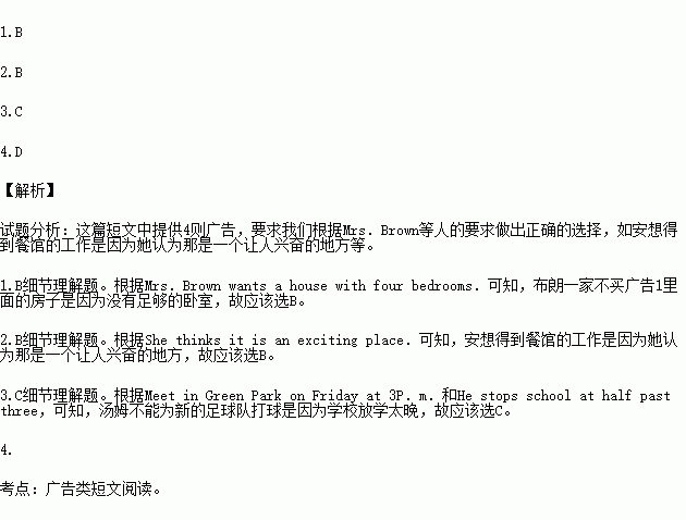 Mr.Brown wants to Live near his workplace.Mrs.Brown wants a house with four bedrooms.The Brown children don’t care what the house is like.They just want a big garden.Ann,their daughter, has always wanted to work in a restaurant.She thinks it is an exciting place.It’s hard work but she is n’t lazy.You have to work on Saturdays and Sundays,but you get other days off.It’s not very well paid.But who cares about money?