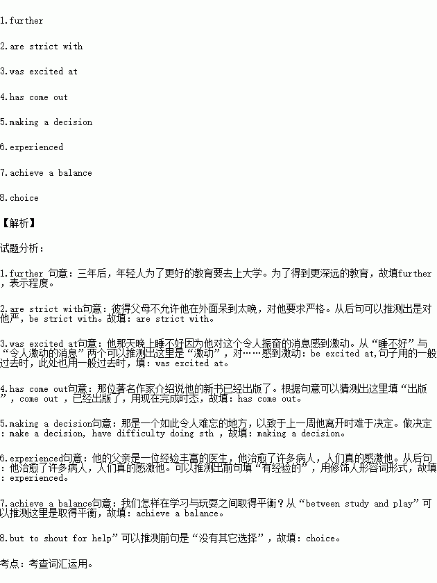 another two, far, invite, achieve a balance, be strict with, choose, experience, be excited at, come out, make a decision, |